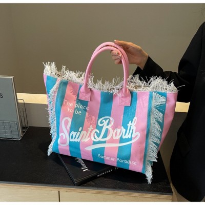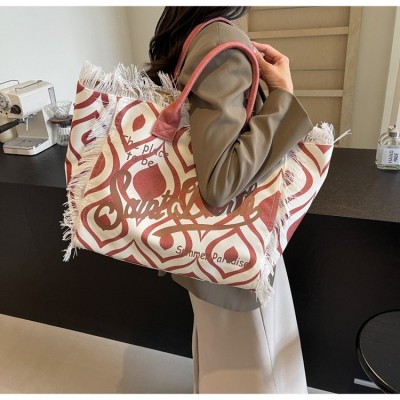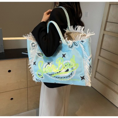 2024新款包包时尚沙滩大容量单肩通勤包手工流苏牛仔印花托特包包